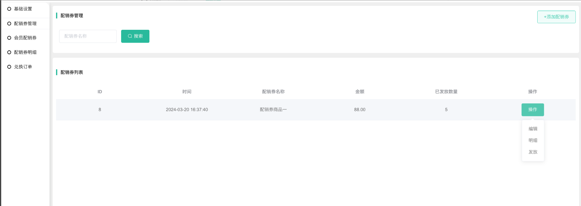 显示所有配销券,在当前列表可查看到已发放数量,点击操作--明细跳转到配销券明细页面,可以二次编辑,支持后台手动发放。