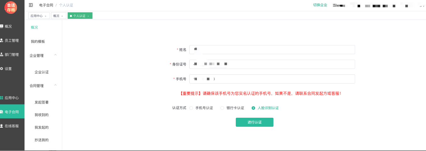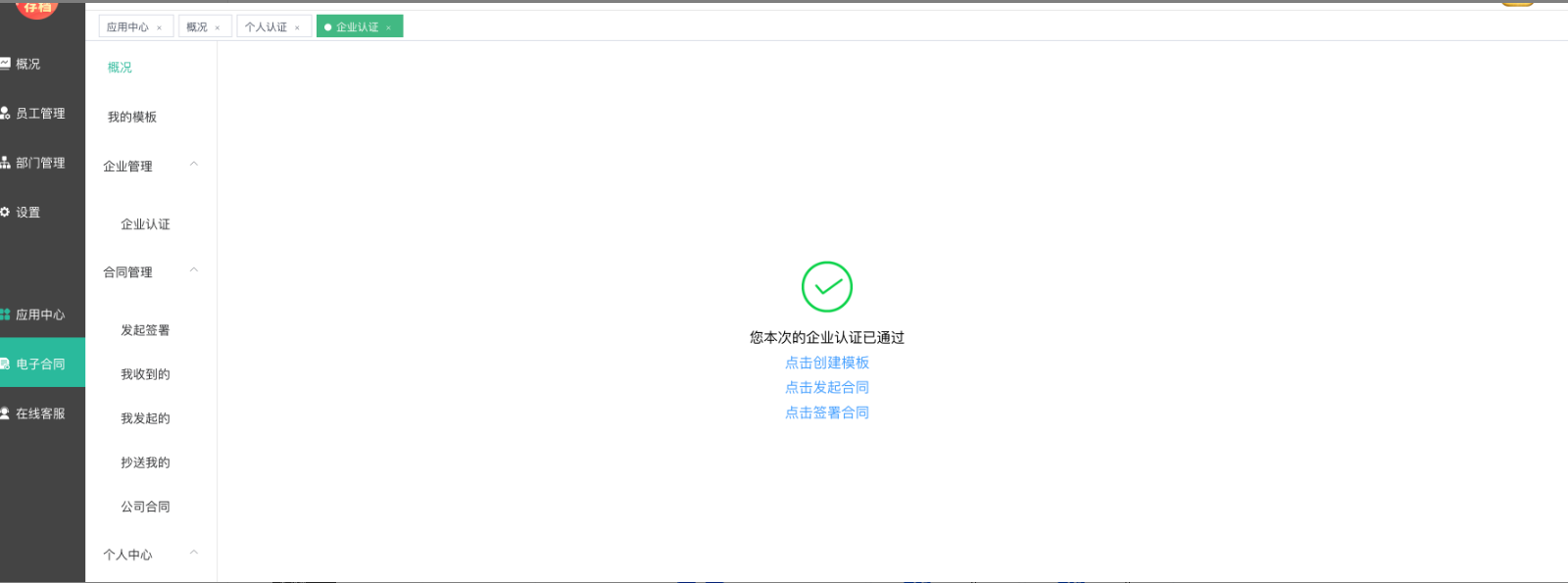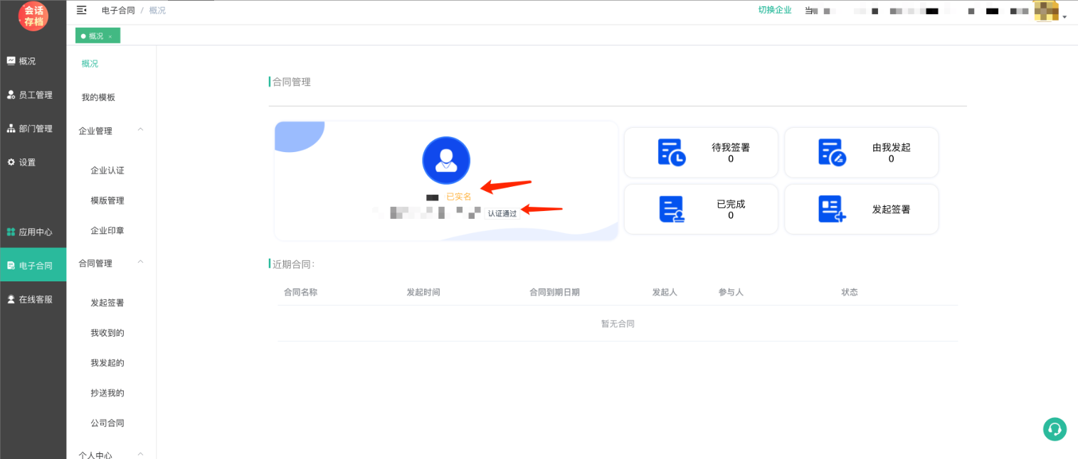 认证通过后,进入电子合同--概述页面,刷新,可以看到个人和企业皆已通过认证