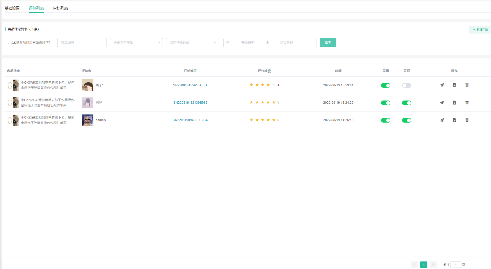 支持查看会员商品评价、是否通过审核、是否显示、是否置顶。